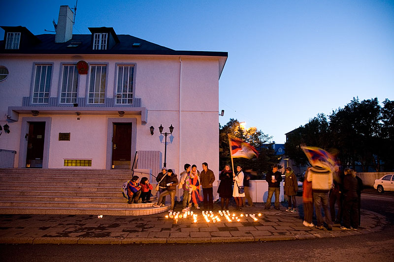 Tibetans and Icelanders join forces and protest against Chinese occupation in Tibet. They have been standing there every saturday for quite some time, this picture was taken the night the Olympics in Beijing ended.
